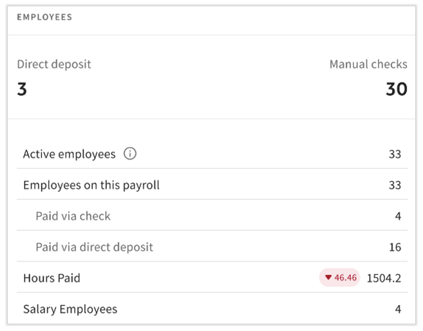 Esta baldosa ofertas una mirada inteligente a información notable sobre esta ejecución de nómina. Si ves un ícono de exclamación en rojo junto a cualquiera de los cuatro temas que se enumeran aquí, es recomendable abordarlos antes de enviar la nómina.
