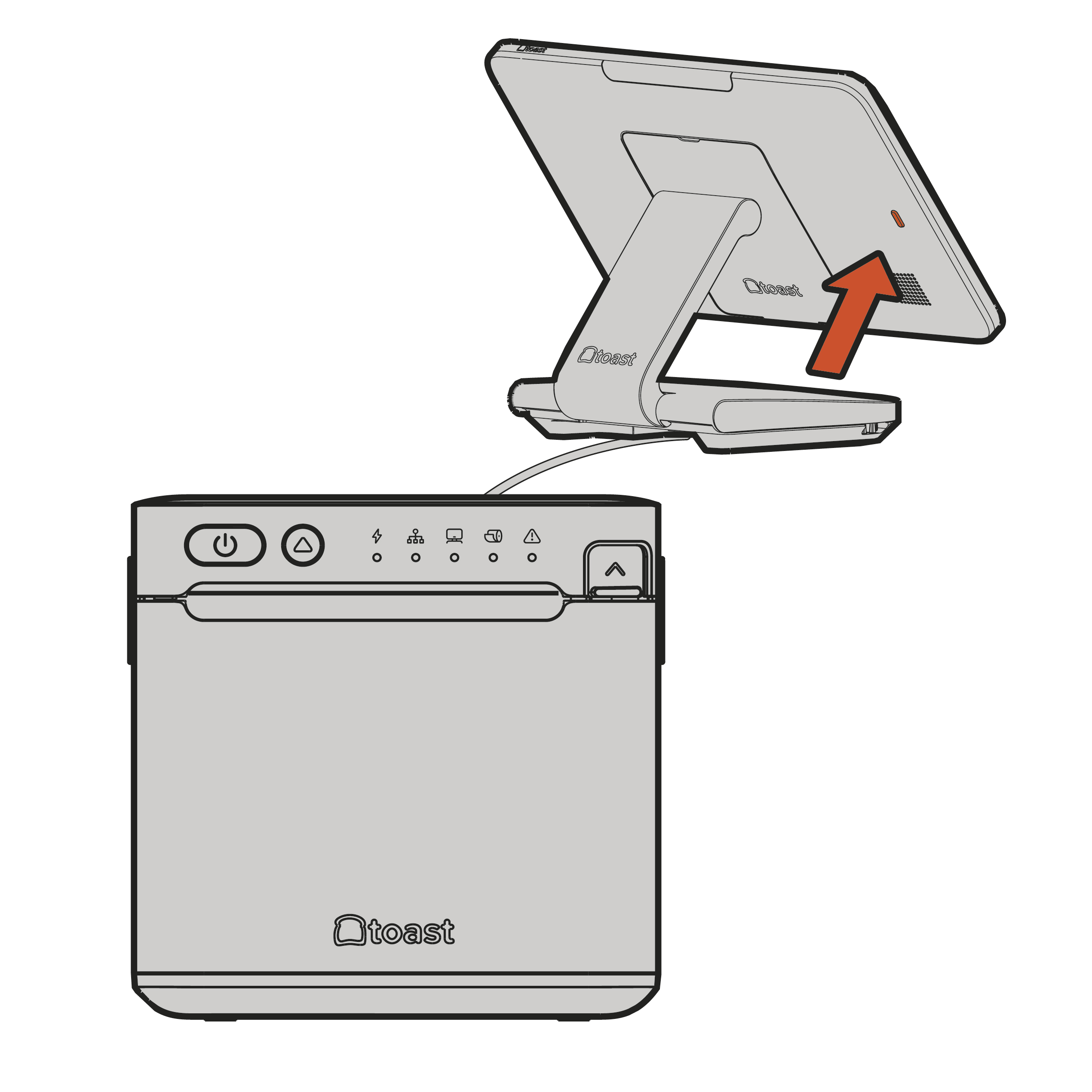 Conecta el cable de alimentación de la impresora Power Plus al puerto Power de tu base de terminal, y el otro extremo al puerto Terminal de la impresora, aprieta los tornillos de mariposa.