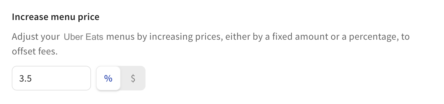 Solo se aumentarán los precios de los artículos del menú en Uber Eats. Los precios de los modificadores no se aumentan. Además, el aumento de precio que establezcas se sumará a los precios actuales de los artículos del menú en tus menús seleccionados de Uber Eats. Esto es importante recordar si ya aumentaste los precios durante tu proceso de incorporación a Uber Eats.