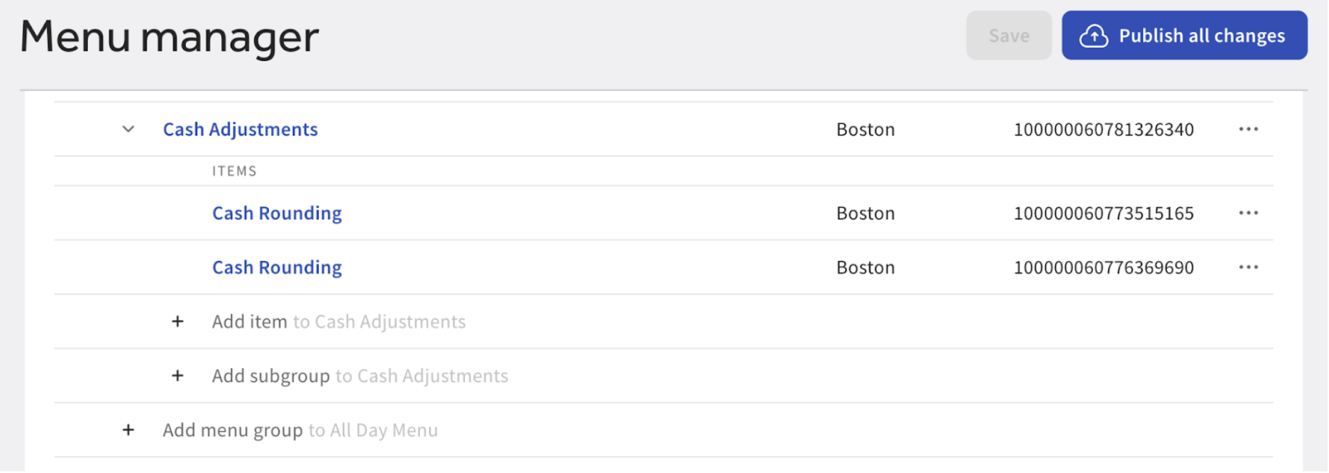 Una vez que hayas creado el nuevo elemento o elementos del menú, asegúrate de Guardar y Publicar tus cambios para que estos elementos aparezcan en el POS para todas las ubicaciones de manejo de efectivo.