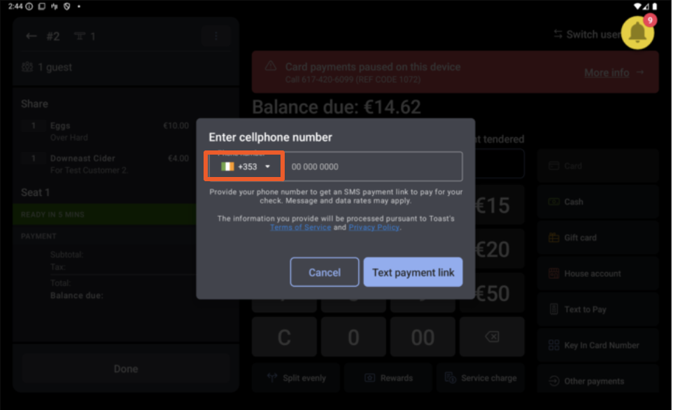 | La función Enviar mensaje de texto para pagar solo está disponible para pedidos en el mismo día. Los clientes que paguen pedidos anteriores deben seleccionar un tipo de pago alternativo para completar la transacción. |
