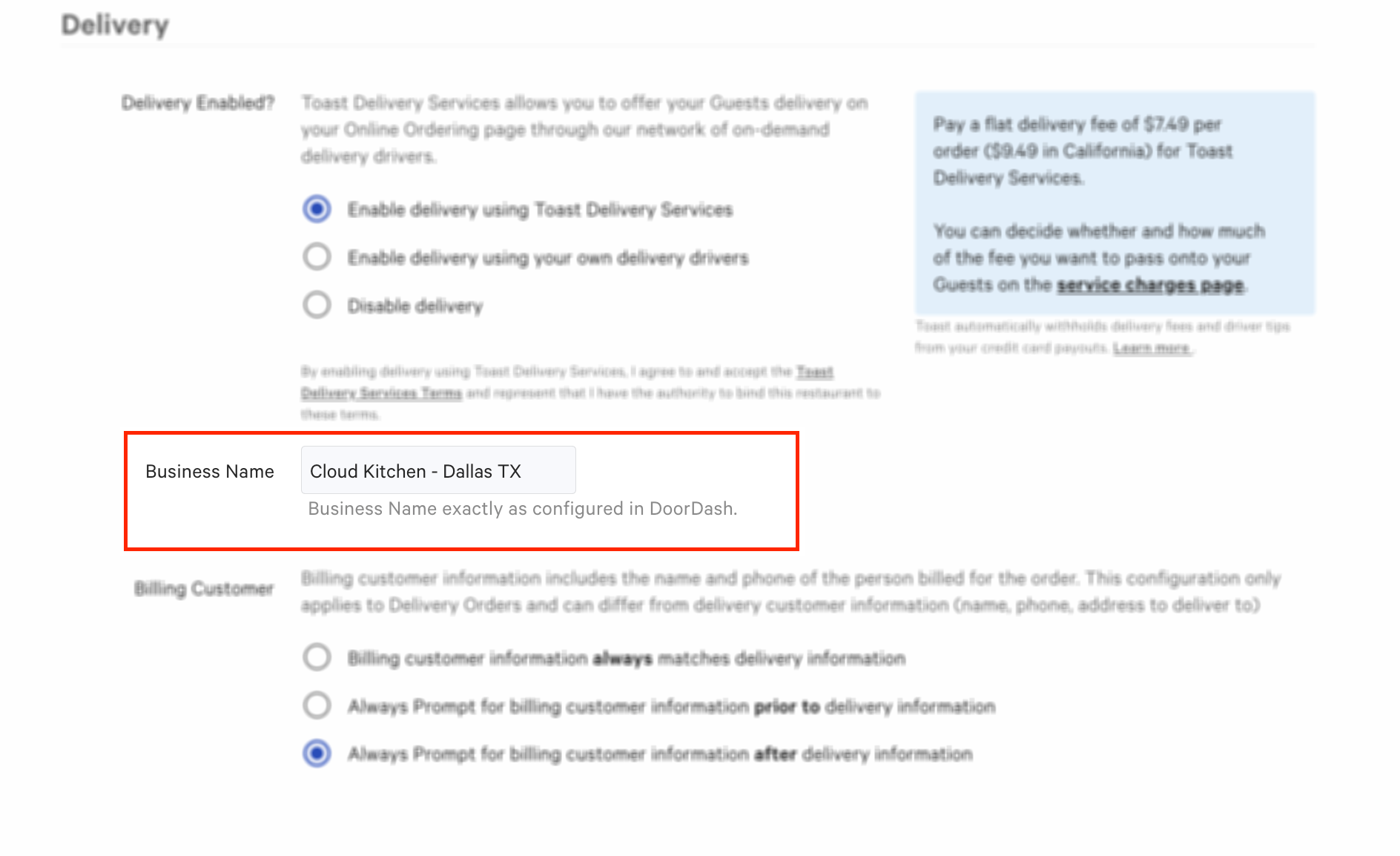 Puedes ver cómo está listado el nombre de tu restaurante/negocio de manera literal navegando en Toast Web a Comida para llevar y Envío > Disponibilidad > Comida para llevar/envío. Aquí puedes localizar la opción Nombre Comercial en la sección de Envío.