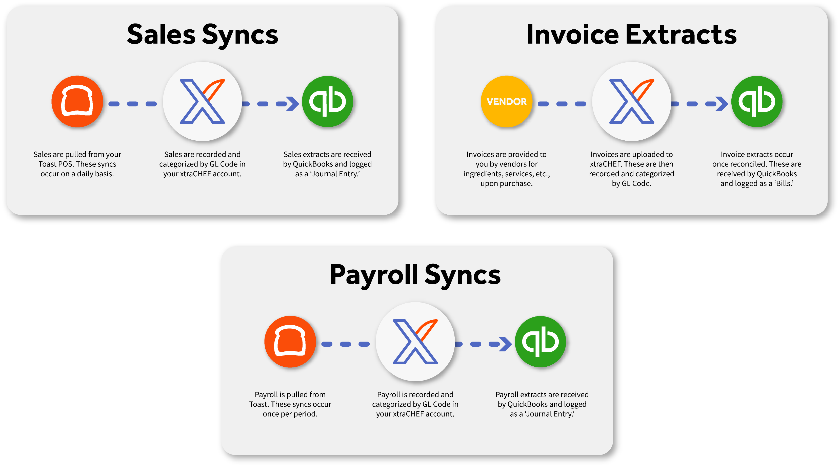 Con QuickBooks Online integrado con tu cuenta de xtraCHEF, las facturas conciliadas, las ventas diarias y las entradas del diario de la nómina pueden comenzar a sincronizarse automáticamente con tu plataforma contable (suponiendo que tu sincronización no se haya desactivado y que se hayan completado pasos de configuración adicionales, como la configuración de ventas).