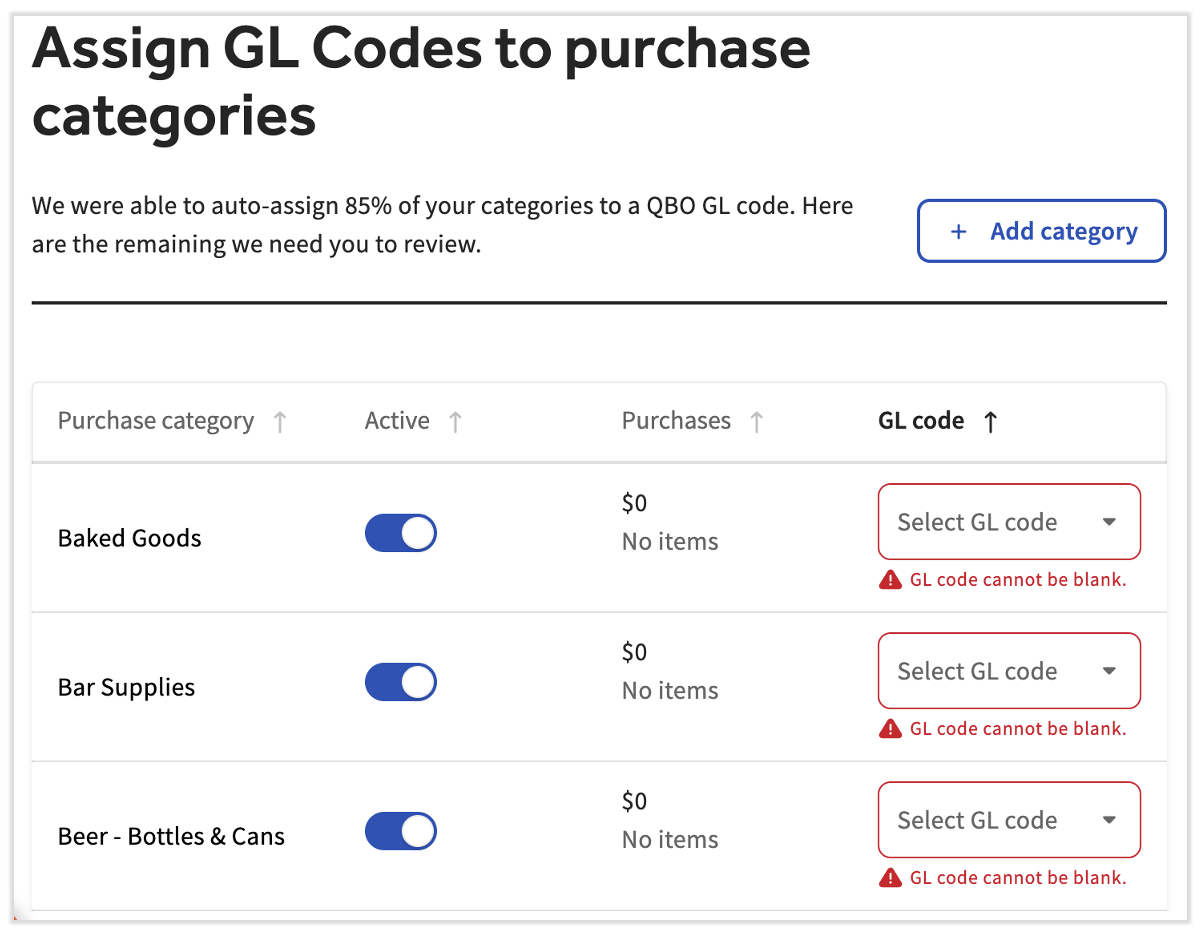 Una vez que tus cuentas de xtraCHEF y QuickBooks Online estén conectadas, puedes comenzar a sincronizar los datos entre los dos sistemas. El primer paso es importar tus mayor de QuickBooks Online en xtraCHEF y hacerlos coincidir con tus de xtraCHEF. xtraCHEF tiene 22 categorías predeterminadas para cada inquilino. Asignaremos automáticamente cualquier código de LM que coincida exactamente con una categoría predeterminada o una que hayas creado antes, pero es posible que tengas que asignar algunos por tu cuenta. Algunos aspectos a tener en cuenta:
