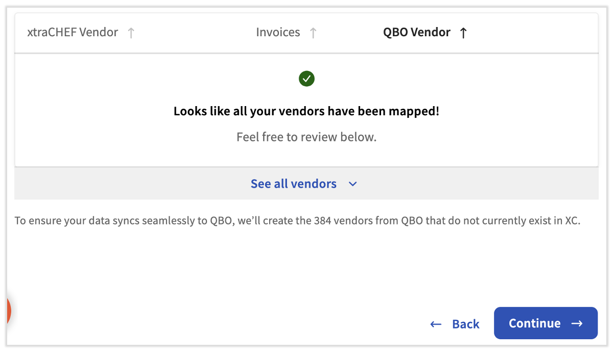 A continuación, sincronizarás los entre los dos productos. Al igual que antes, asignaremos automáticamente cualquier proveedor de xtraCHEF que coincida exactamente con un proveedor de QuickBooks, pero es posible que debas asignarlo tú mismo. Selecciona Agregar proveedor para agregar un nuevo proveedor directamente en QuickBooks Online.