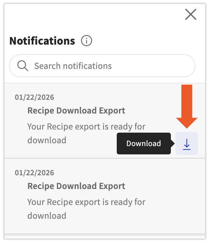 Si seleccionaste un PDF, recibirás una notificación pequeña que indicará que esta solicitud se está procesando. Cuando esté completo y listo para su descarga, recibirás una notificación en la esquina superior derecha de cualquier página de xtraCHEF. Una vez que veas un punto rojo junto al ícono de la campana, selecciona el ícono de campana. Ahora selecciona la flecha de descarga de tu exportación de descarga de recetas.
