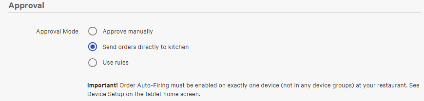 Note: To turn off manual approve for Online Orders select the option Send orders directly to kitchen.
