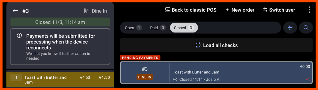 When an offline payment is taken, you will see the following alert pop-up below to let you know that an offline payment has been made: Alert offline payment: Offline payments require an active internet connection to process and may be prone to rejection or decline. You're responsible for any rejection or declined transactions in offline mode. Please contact customer care if you want to discontinue offline payments.