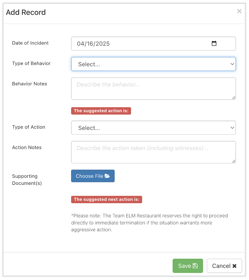Toast 薪资管理系统中的某些餐厅有一项名为“渐进式纪律”的功能,允许经理记录员工的行为和为此采取的行动。经理需要同时选择由 Toast 薪资管理系统客户服务部配置的行为和操作,因此在使用前需要进行一些设置。 要在累进纪律模块中添加条目,请执行以下操作: