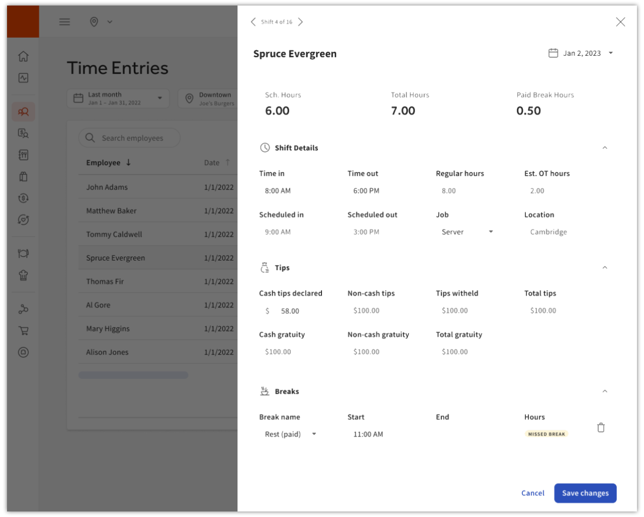 有关如何使用“审核员工班次”功能的完整描述,请参阅这篇 Toast Central 文章的“”中的“在 POS 机系统上更新时间条目”部分。