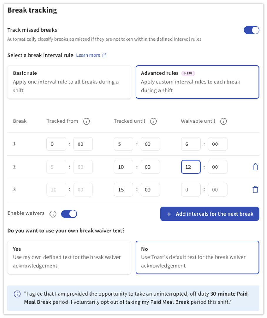您可以选择跟踪员工是否进行了特定的休息。例如,如果您所在的州要求员工在轮班开始到一定工时之间休息无薪餐(并且可能必须在轮班指定时间内休息),您现在可以在 Toast Web 中配置和跟踪这一点。
