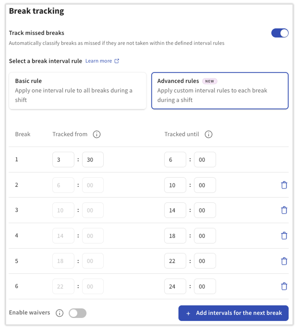 使用高级规则为班次内的每次符合条件的休息应用自定义间隔规则。