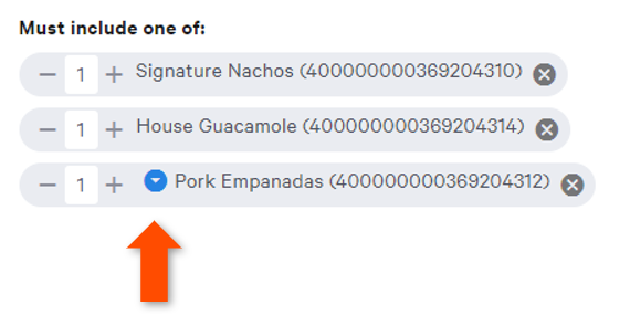 选择尺寸或修改器选项可以让您在折扣中突出显示像中杯咖啡或意大利香肠披萨这样的特定商品。需要修改器选择的特定商品或组将在商品/组名称前显示蓝色箭头。