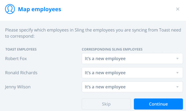 员工数据:员工信息,如姓名、职位、地点和工资,从Toast同步到Sling。在Toast中更新员工详细信息,以保持Sling的准确性。