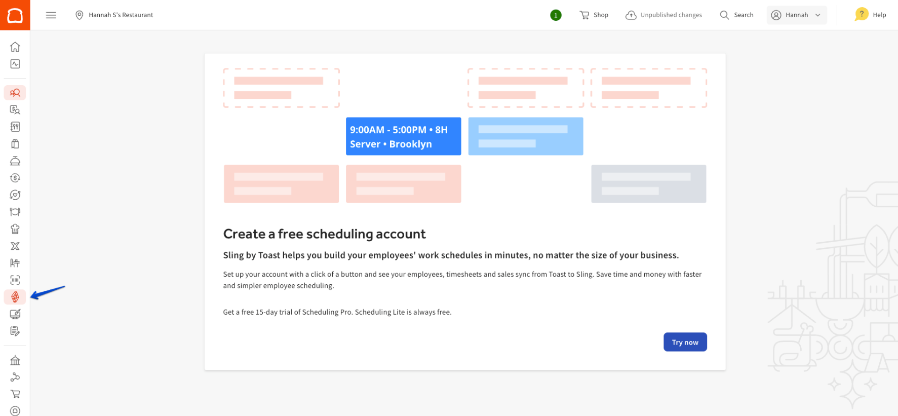 通过您的 Toast 账户,您可以使用 Sling 的 Scheduling Lite 或 Scheduling Pro 版本。本文解释了哪些数据会同步,如何创建新的 Sling 账户,以及如何将现有的 Sling 账户连接到 Toast。