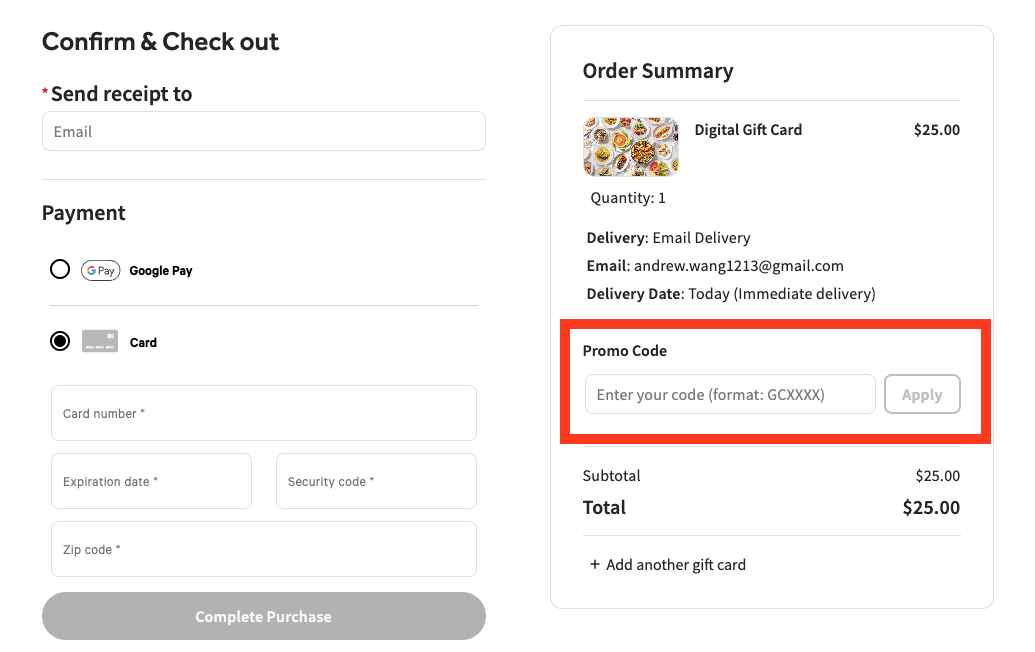 要在线兑换礼品卡折扣或促销代码,客人可以在下面图像中看到的 优惠码 或 促销码 字段中输入他们的折扣促销代码,并选择 应用。
