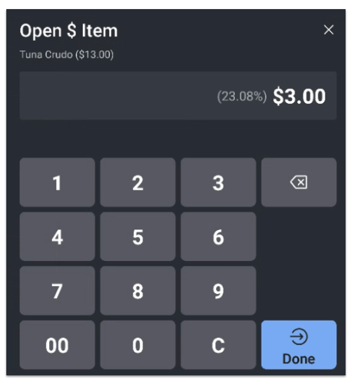 在下面的示例中,我们想要对 13.00 美元的调性 Crudo 折扣 3.00 美元,显示为 23.08% 的折扣。