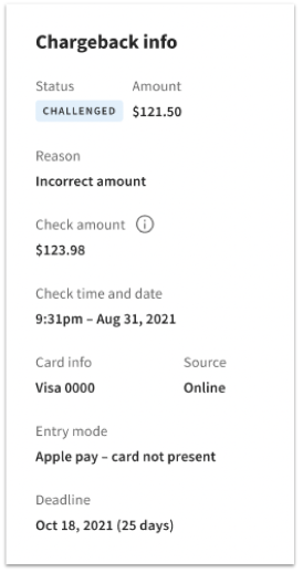 | 此chargeback已被挑战,正在等待银行或卡网络的决定。这可能需要长达180天。 | |