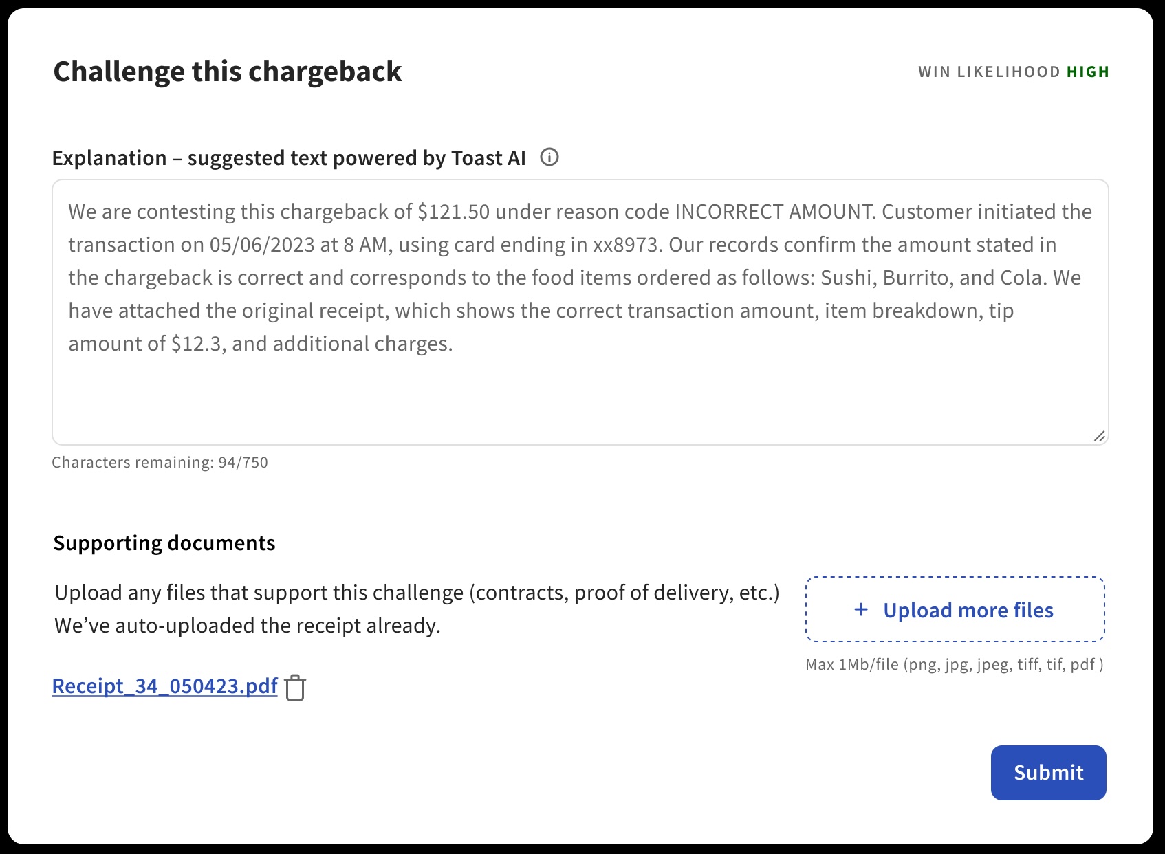 胜率是基于我们的数据的估计,挑战的结果最终由客人的银行或支付网络决定,因此高胜率并不保证成功。特定挑战的成功也取决于您提交的证据质量。虽然Toast提供工具来挑战退款请求,但您仍然对挑战退款请求的决定及任何由此产生的责任,包括产生的任何网络费用负责。