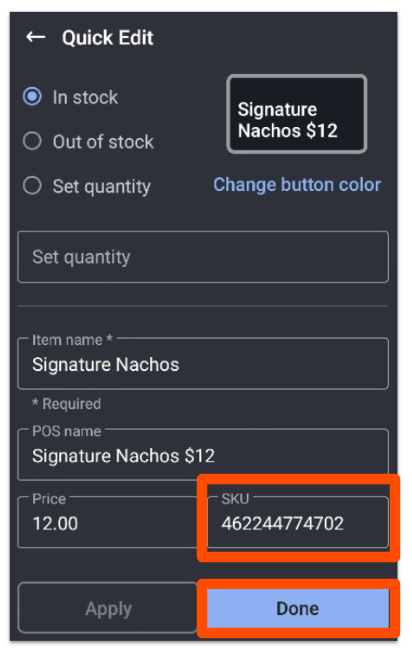 一旦该项目已发布,您可以在POS的搜索字段中扫描或手动输入分配的SKU,以将该项目添加到账单中。
