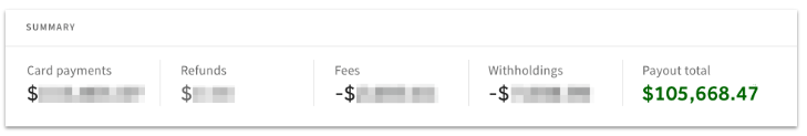 如果您使用 OptBlue,此报告会汇总所有卡片的支付额、退款额、手续费和净存款额。如果您是 American Express 直营商家,报告将包含列出 Visa/Mastercard/Discover 支付额、退款额、手续费和净存款额的独立列。