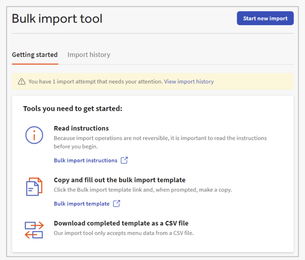 您可以离开“未完成导入”页面,但不修复并重试失败的导入(您可以通过选择关闭图标 (X) 离开“未完成导入”页面,或在 Toast Web 中导航到其他页面,或完全关闭 Toast Web)。如果您离开“未完成导入”页面,批量导入失败,那么下次访问“批量导入”工具页面时,您会在“开始”选项卡上看到一条通知,告知您有一个或多个导入尝试需要关注。在您解决批量导入失败的问题之前,此通知将保留在“开始”选项卡中。