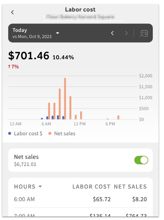 从 Toast Now 主页选择“人工成本”卡片,可显示所选日期的每小时人工成本。在此页面上,您将看到“净销售额”切换开关,您可以使用该开关在图表和表格视图中逐小时比较人工成本和销售额。