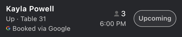 通过 Google 进行的预约将在迎宾员应用中按下图标记,并在 Toast Tables 报告中标明为预约来源,如下所示。