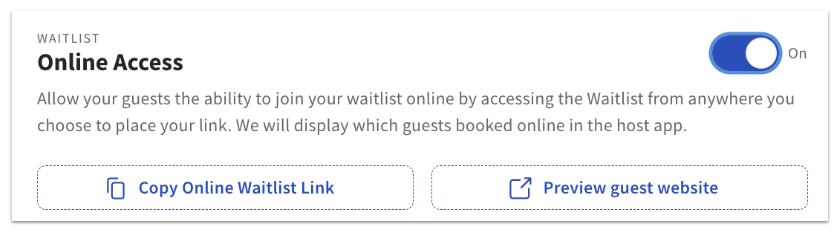 有了 Toast Tables,客人可以在线加入等候名单。如要配置等候名单的“在线访问权限”设置,您需要首先在设置顶部将其切换为“开启”,并选择要将在线等候名单用于哪个服务时段。