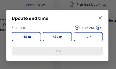 在 Toast Web 中导航到预订部分,并在预订时间的“结束时间”处选择“编辑”,以便在提供的间隔(15 分钟、30 分钟、1 小时或 +/- 5 分钟)中添加或删除时间。