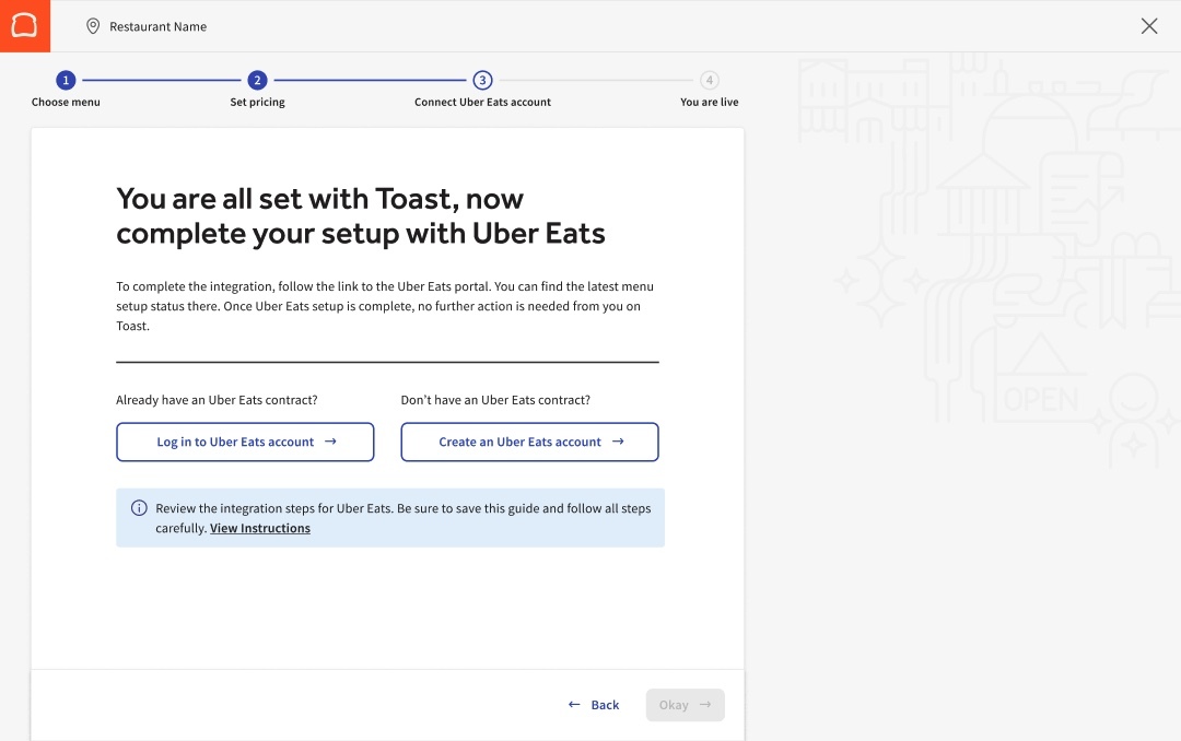 如果您在完成集成清单之前没有 Uber Eats 账户,清单的最后一步将引导您进入 Uber Eats 账户设置页面,开始在 Uber Eats 平台上创建账户的过程。 由于 Toast 和 Uber Eats 账户都需要集成,集成可能会延迟。