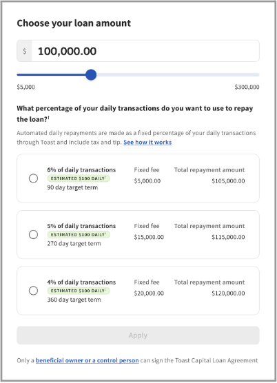 Note: These terms are an example of a pre-qualified offer and are not representative of an actual Toast Capital Loan.
