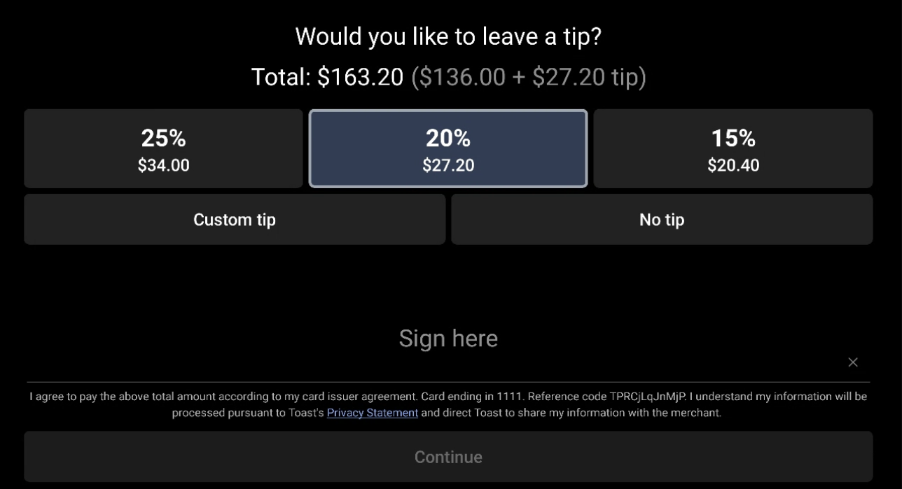 非接触式支付图像可能有多种形式,并且不会影响小费屏幕或顾客显示器的任何核心功能。这些图像将由Toast设计和运行,不需要您团队的任何操作。
