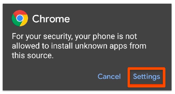| 1. 首先,在您的移动设备上打开网页浏览器,并在导航栏中输入 APK 链接 。看到下面的消息时,选择“设置。 | |