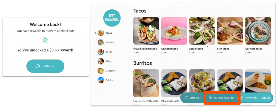如果您的客人在您的餐厅已经有会员账户,并且他们输入了他们的信息,他们将看到一条欢迎信息,显示他们可用的奖励。在订单过程中,他们还会在屏幕底部看到一个“您有奖励!”按钮(如果适用),可以选择查看可用的奖励。