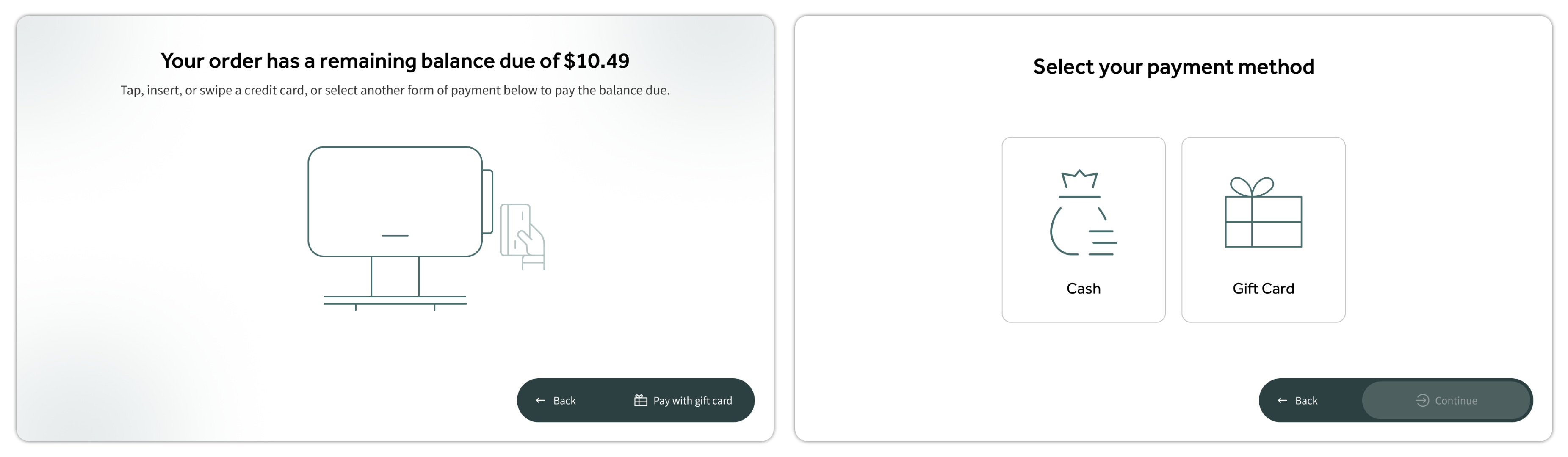 工作原理: 如果客人的第一张礼品卡无法覆盖全部订单,自助点餐机将自动提示他们输入另一张礼品卡或选择其他支付方式以完成剩余余额。
