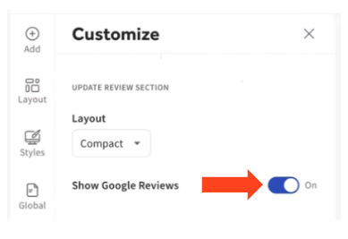 如果您已将 Google 评价添加到您的网站,并希望禁用此功能和/或手动添加评价,请将“显示 Google 评价”切换为“关闭”。保存并发布您的更改。