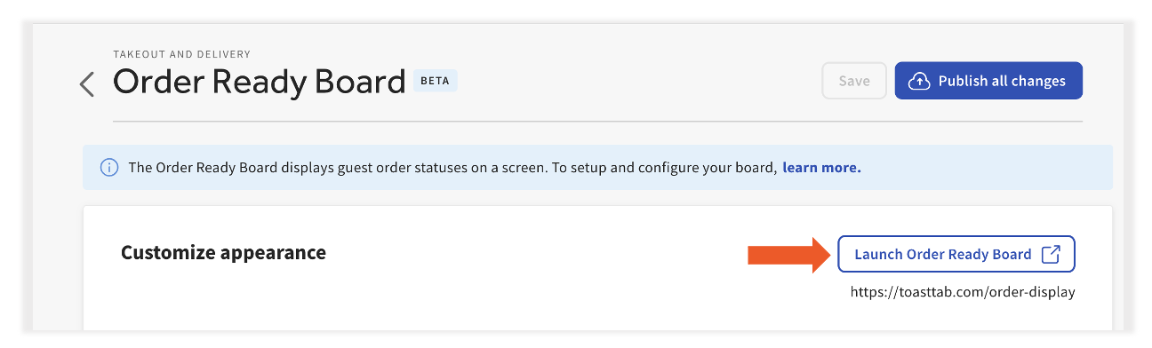 您可以通过 Toast Web 或通过 Toast 认证链接登录并启动订单准备板:https://www.toasttab.com/order-display。将链接复制并粘贴到您的浏览器中。
