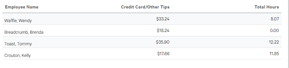 “汇总小费报告”收集一个班次内所有关联至账单的信用卡小费(非现金小费),并在账单开启期间处于打开上班状态的服务员之间进行分配。您可以通过导航至“报告”>“人工”>“汇总小费”,在 Toast Web 中找到此报告。小费与账单开启时间相关联,并且仅在账单开启时处于打卡上班状态的服务员之间分配。以下是几个示例: