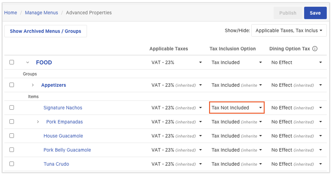 Toast 提供了一种快速简便的方法,通过 高级属性 工具查看和修改所有菜单项的基本税设置。
