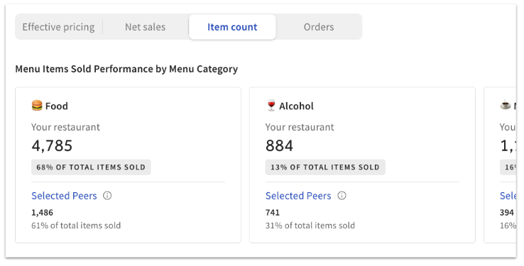 “菜单见解”选项卡提供数据,说明您所选筛选条件中菜单单品类别与普通餐厅的比较情况。 Toast 基准比较分析基础版用户才能获得单品级菜单见解。