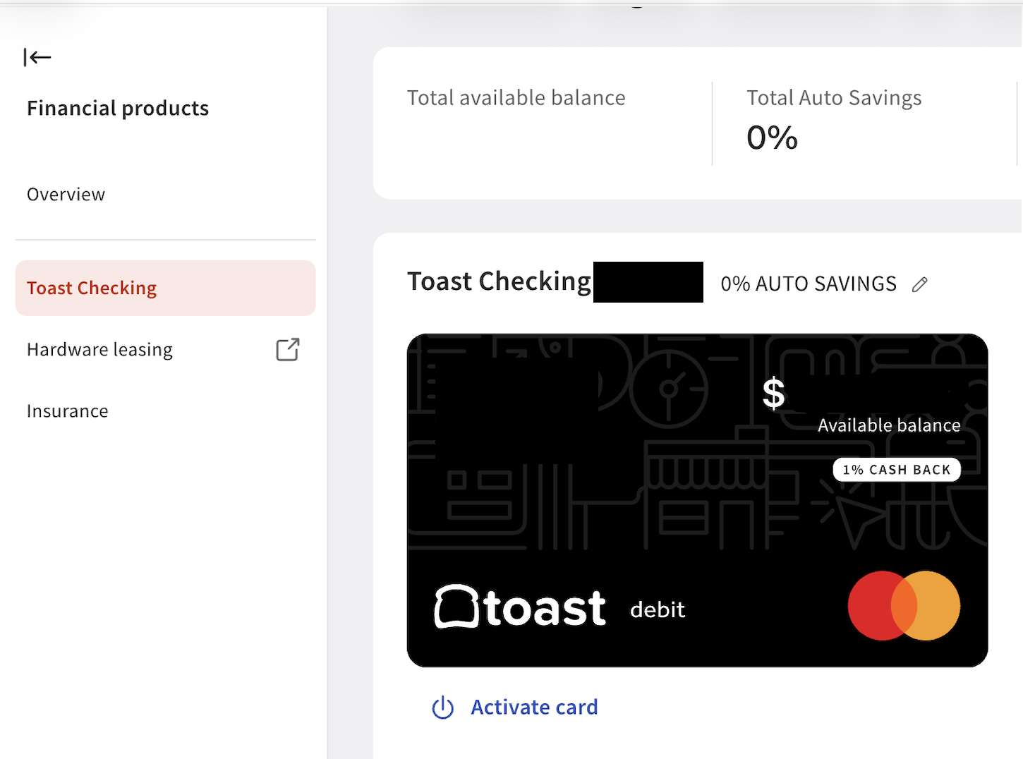 You may activate your debit card by navigating in Toast Web to Financial products > Toast Checking > select the Activate card option below the image of your debit card. You will be required to set a four-digit numerical PIN during the activation process.