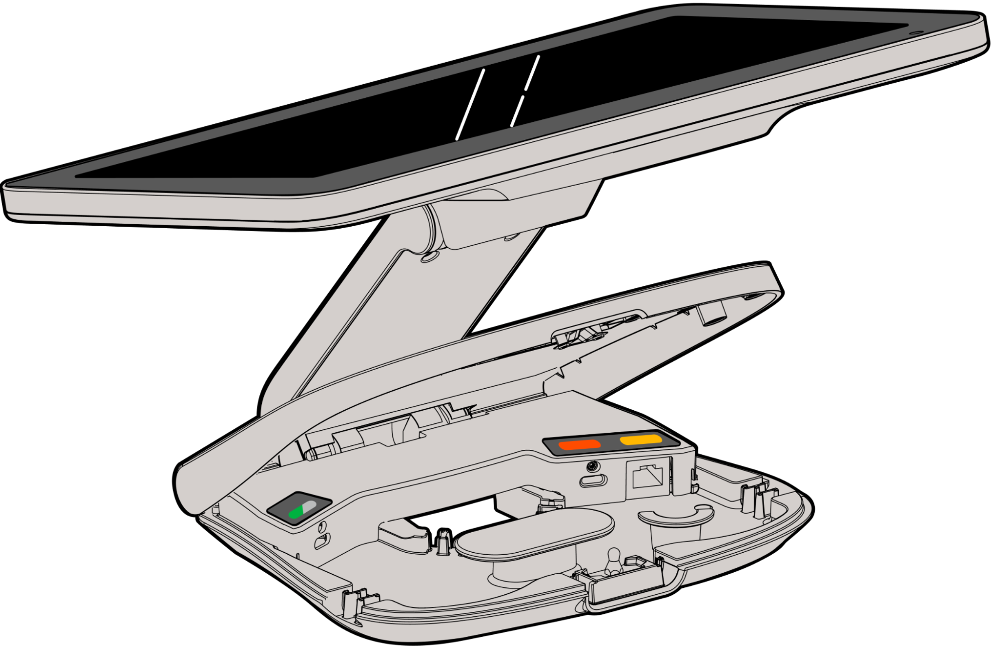 Toast Flex 3 终端由一个屏幕、一个带有两个铰链的颈部和一个带有内置电缆连接和管理的底座组成(见下图)。它旨在供客户在前台环境中使用,这些环境对客人可见,并且空间限制要求终端的视角可调。