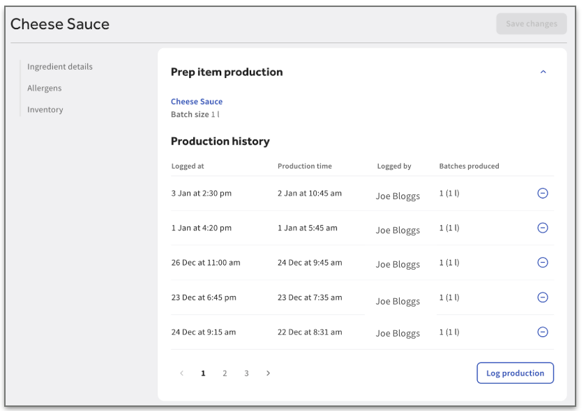 查看库中的预制单品时,将显示专门的预制单品制作部分。此部分包含原始食谱和当前批次大小的链接。要记录批次: