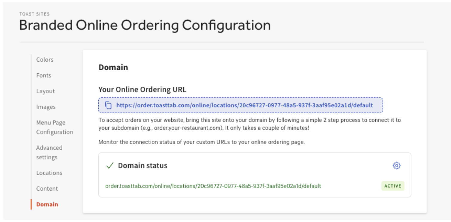 | 在 Toast Web 的左侧导航中,选择 网站。 在您的 网站仪表板 上,导航到 管理您的域名 部分。 | 在 Toast Web 的左侧导航中,选择 外带和配送 > 品牌和自定义 > 品牌和自定义配置。 在 品牌和自定义配置 左侧菜单中选择 设置。 |