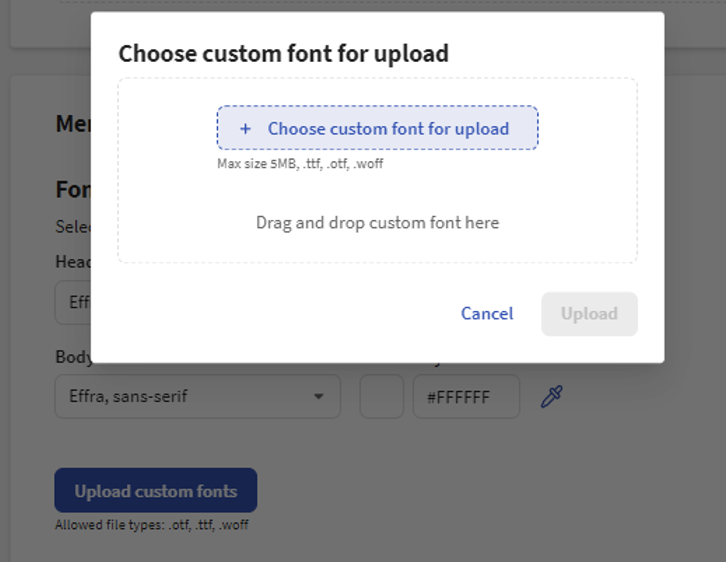 虽然有多种可供选择的选项,但您也可以选择上传自己的自定义字体。字体可以直接从您的计算机上传。字体必须为 .otf、.ttf 和 .woff 格式才能上传。