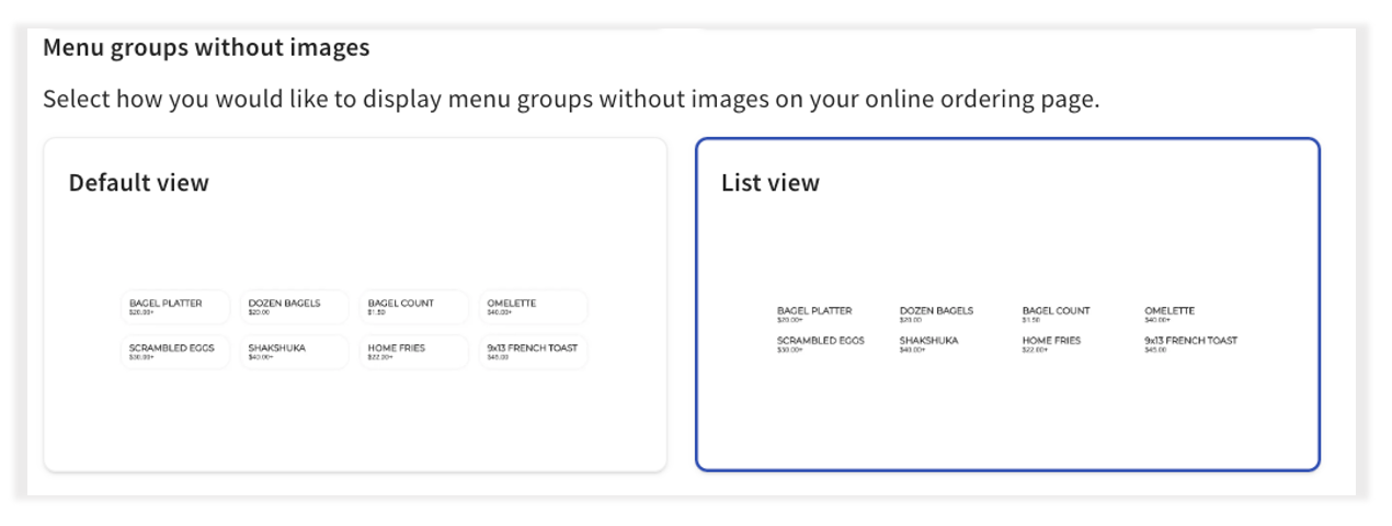 Toast 在线点餐专业版具有优化方形或矩形项目图像的菜单布局选项。所有图像将在所选菜单布局内填充容器。Toast 在线点餐专业版菜单模板支持 1:1(方形)、4:3(矩形)和 16:9(矩形)纵横比。我们建议最小高度或宽度为 1000 像素,以确保高图像质量。