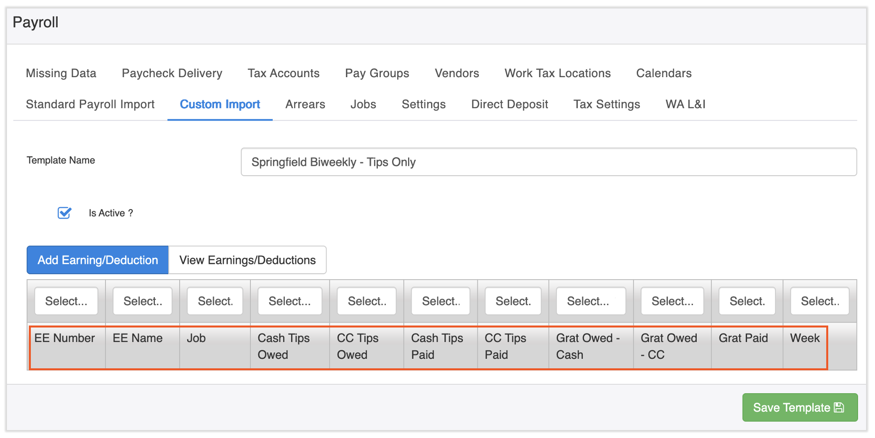 如果您为每个薪资组导入了相同类型的数据,则可以使用一个自定义导入模板。如果您的薪资组有不同的导入需求(例如,一个薪资组需要导入工时和小费,而另一个薪资组只需要导入小费),您可以创建多个模板。注意:如需为多个门店导入文件,请通过任意 Toast 薪资管理系统页面右下角的蓝色聊天点联系我们,讨论后续步骤。