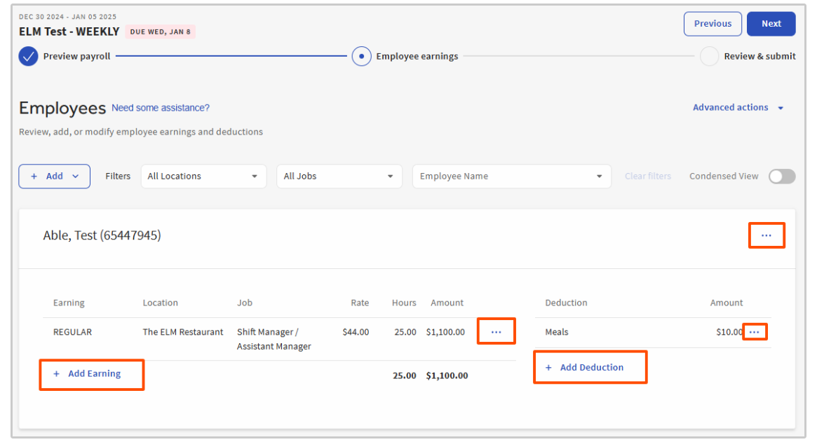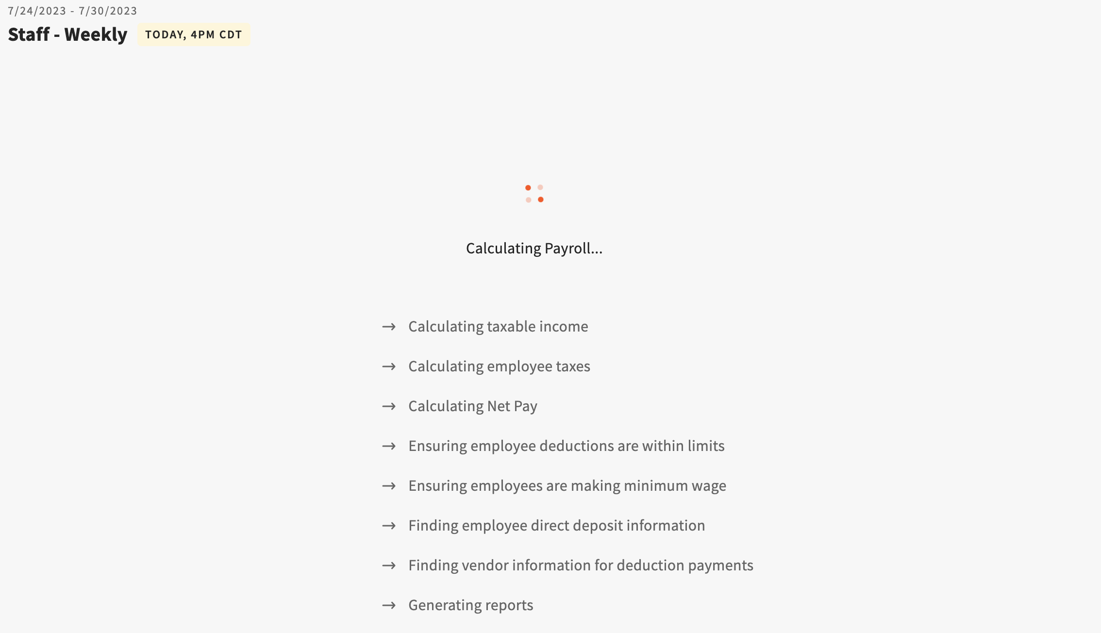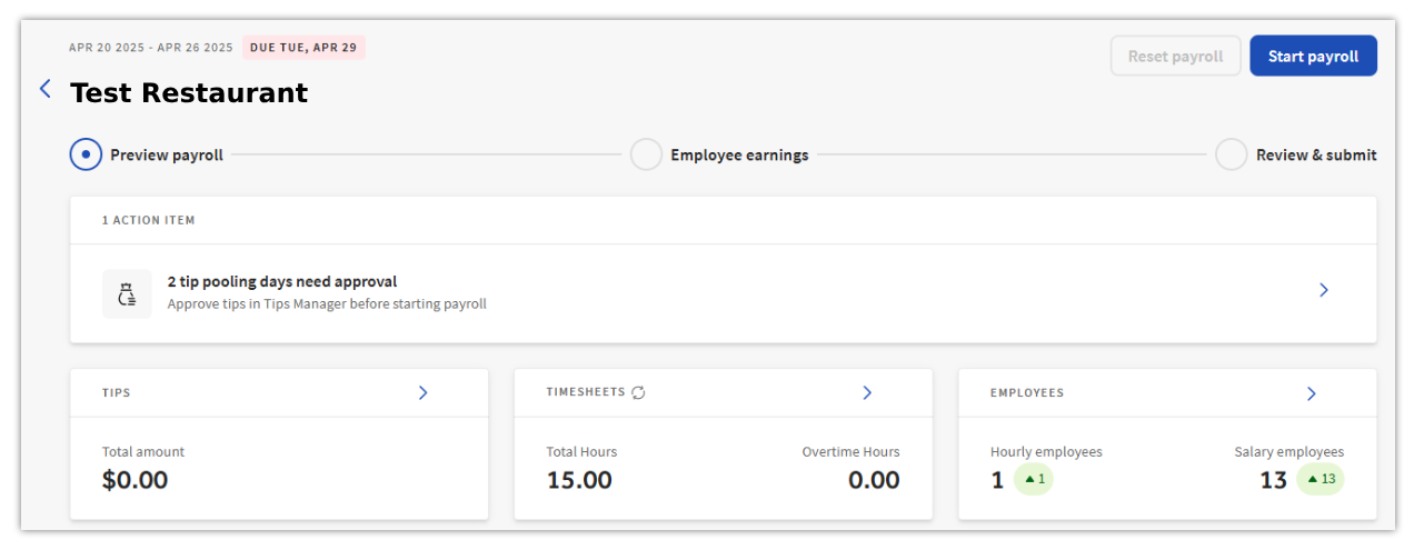 在开始发放工资之前,您可能需要批准员工的工作时间表。导航至“打卡上班时间”,记下顶部的切换开关。如果启用此功能,Toast Web 中的时间记录将自动显示在工资单的“员工收入”步骤中(见下文第 5 步)。如果禁用切换开关,我们强烈建议将页面筛选到当前薪资周期,以便审批时间表(使用薪资列上方的下拉菜单)。如果您对 W-2 表和”以了解更多信息。