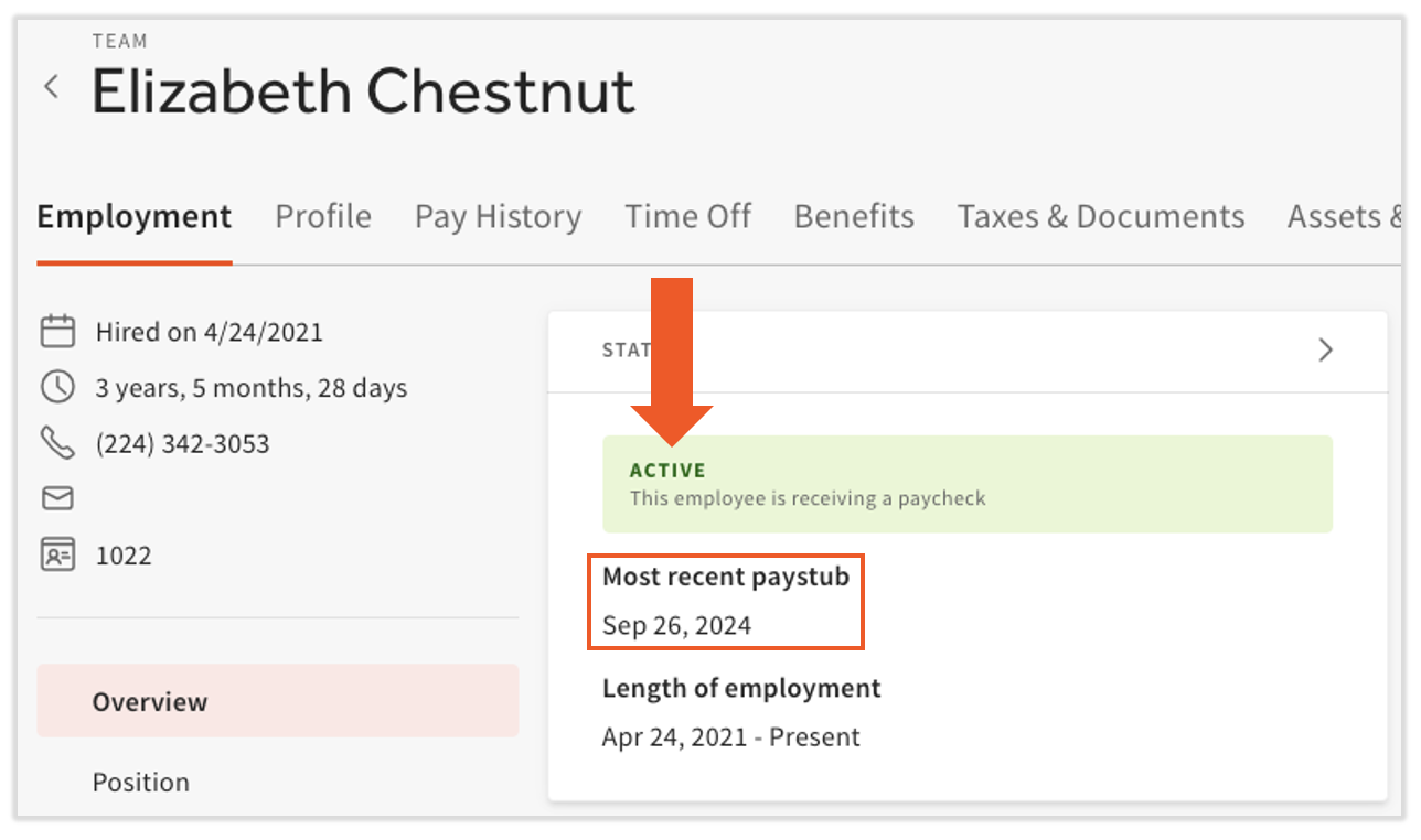 我们可以通过查看特定资料,一目了然地了解谁是在职员工。以 Elizabeth Chestnut 为例,假设月份为 2024 年 10 月。Elizabeth Chestnut 在个人资料的状态磁贴上显示为“活跃”。即使他们最近的工资单是在 2024 年 9 月发放的,该员工仍将计入您每位员工的每月账单中。若您知道该员工近期内不会收到工资,您可以决定将其或设置为关系状态,以将此员工的状态更改为非活跃状态。